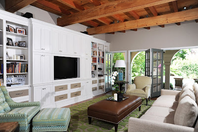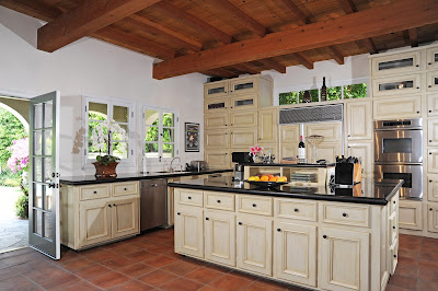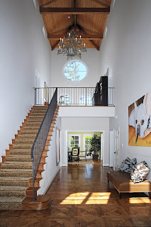 The 3,266 square foot gated home has three bedrooms and three-and-a-half baths. A courtyard leads to the entrance where there is a double-height foyer. There is a stone fireplace and banks of French doors in the living room. The large family room opens to a formal dining room and rear covered patio.