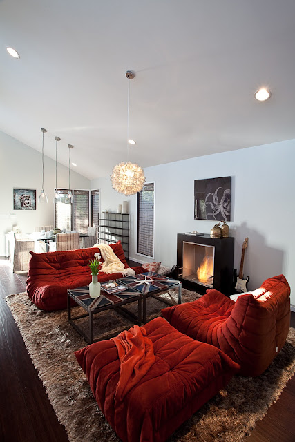 The 1,297 square foot, 3 bedroom, 2 bath single-story modern bungalow was originally built in 1953 and has been taken down to stud with responsible debris disposal and recycling methods. The eco renovation and design includes: operational clerestory windows for natural light infusion and air circulation; radiant floor heating; bamboo floors installed with “green” glues; Energy Star gourmet appliances; non VOC interior paints; an eco ethanol fireplace; Greenguard certified countertops, and all built-in cabinetry employs sustainable materials and methods that are FSC certified and do not off-gas.