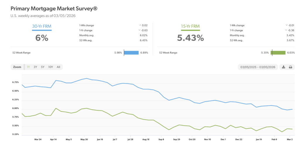 Mortgage rates -– Every Thursday, Freddie Mac publishes interest rates based on a survey of mortgage lenders throughout the week. The Freddie Mac Primary Mortgage Survey reported that mortgage rates for the most popular loan products as of March 5, 2026, were as follows:
